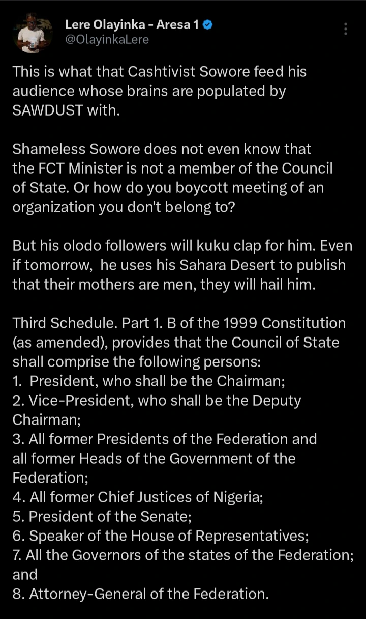 According to his statements, he pointed out that the former governor of Rivers State was not a member of the national council of state. He accused the founder of Sahara Media, Sowore of pushing propaganda.